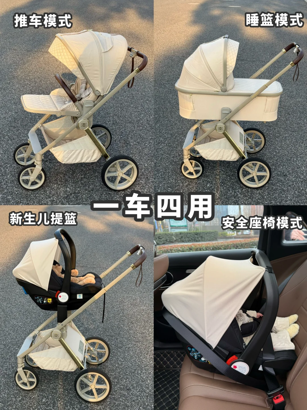 全家都在夸的婴儿车!! 一辆车可以4️⃣种用法,真的🐮 可以秒变提篮模式 睡篮模式 推车模式 安全座椅模式 - 根据宝宝不同月龄任意切换! 质感颜值也没话说!推出去就被要🔗那种 配色一整个高级✌️ 这款车车我真的一眼相中 直接给妹妹整一个三合一🚗 0-4岁一次性搞定!! 再也不用乱七八糟入很多车车了 - 大尺径后轮避震效果杠杠的. 宝宝坐着贼稳当,一点都不会颠簸✌️ 车车可双向调节,小月龄面朝妈妈,大月龄看风景 收车也很简单 一个人带娃出门轻松搞定👍🏻