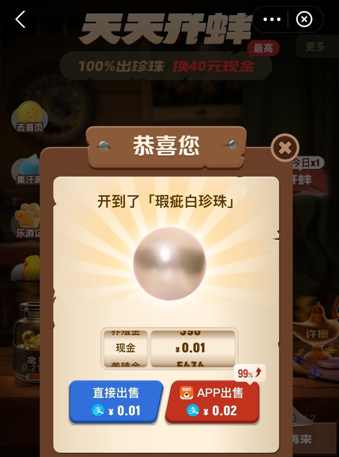 一位哲人说过,你要想寻找到快乐,就养一只自己喜欢的“宠物”。 没有养小狗,也没有养小猫,就在支付宝“乐动力”小程序里养了一只“蚌”! 这只蚌很乖,只喜欢吃点儿“养殖金”。 善良的“蚌”天天还会在开合间产出珍珠、稀有珍珠,甚至金珠! 这不,今天我的宠物“蚌”又开出了0.01mg金珠,特别的开心! 同时宠物“蚌”还开出了“瑕疵白珍珠”一枚,现金价值0.01元,要是放到“乐动力”APP上售卖,价格直接翻倍! 有和我一样喜欢“天天开蚌”的小伙伴吗? 今天你开出金珠了吗? #晒图笔记大赛#
