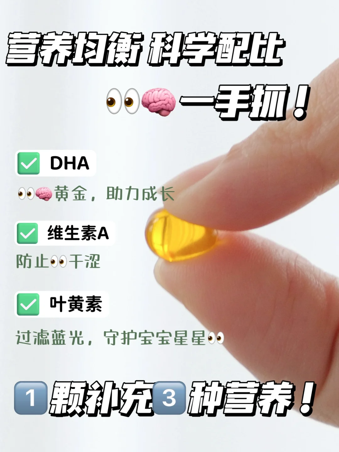 💪说回这款DHA,原料选用的是优质裂壶藻,DHA的含量和纯度都很nice,别看它只有小小一颗,一颗小金珠的DHA含量高达100mg,轻松补充每日所需!除此之外还额外添加了叶黄素和VA,护👀效果🆙🆙配合DHA可以更好的促进宝宝👀🧠成长!