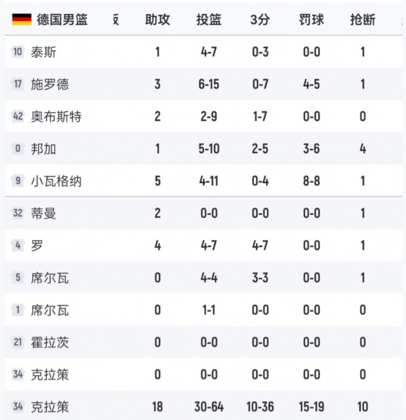 欧锦赛1/8决赛,德国男篮85-58大胜葡萄牙,晋级八强。 本场比赛,德国男篮全队外线手感不佳,全场三分球36中10,其中前24投仅1中! 本场比赛,德国男篮首发五人三分球合计26中3,其中施罗德三分球7中0,奥布斯特5中0,小瓦格纳4中0,泰斯3中0,邦加5中2。