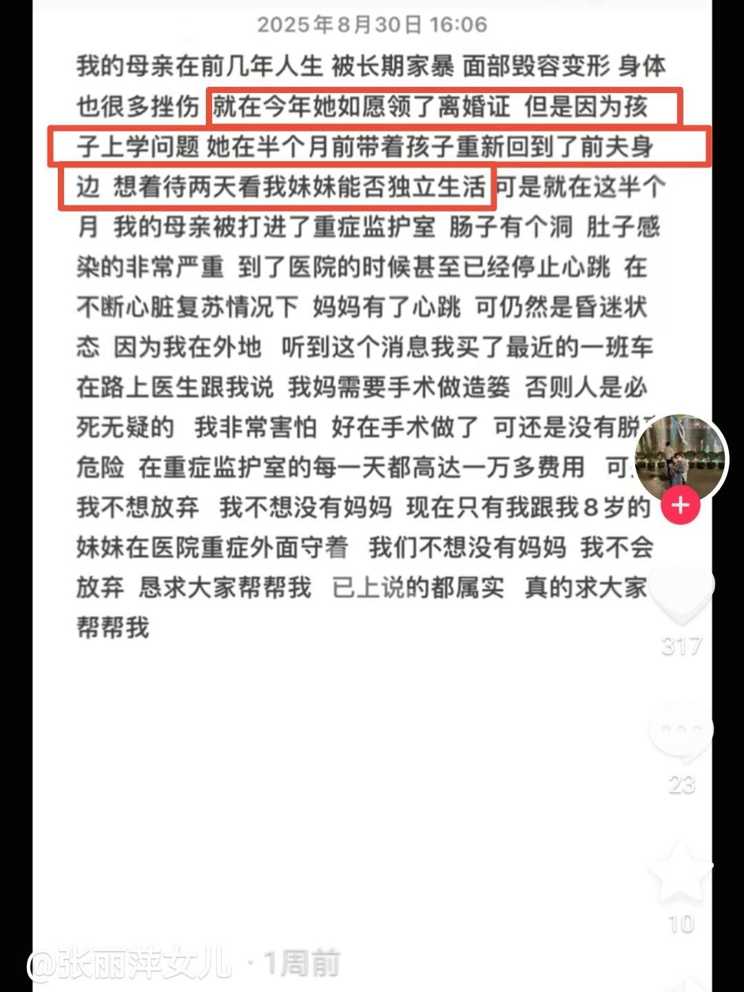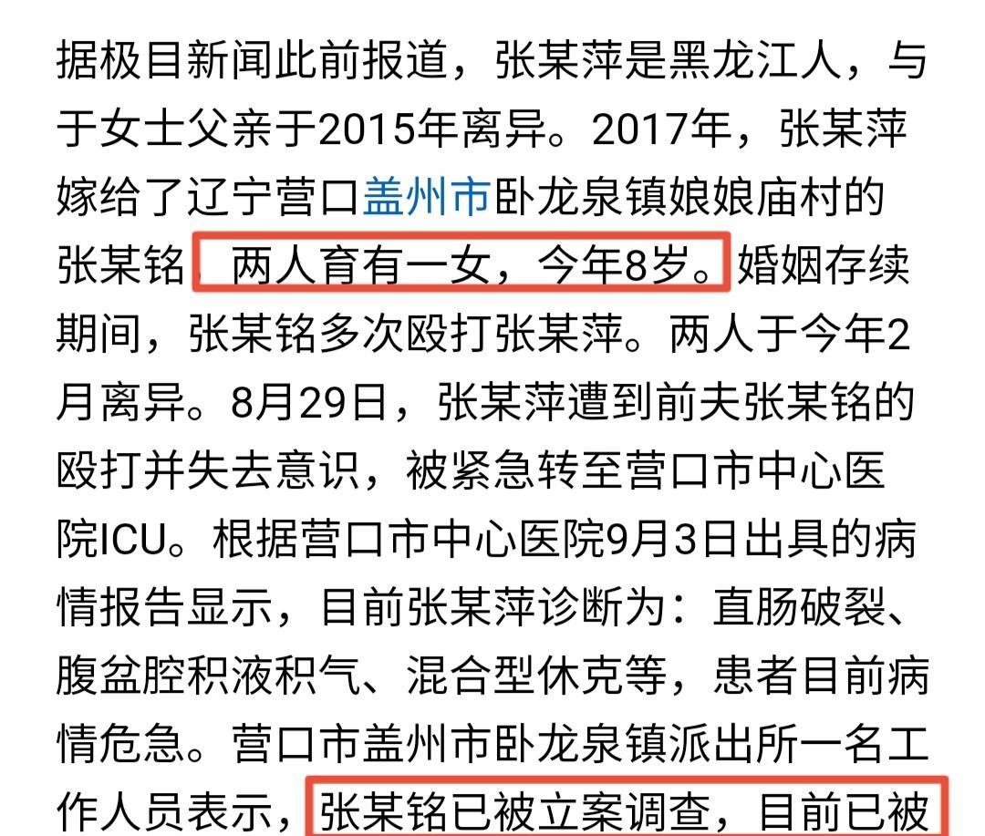被前夫殴打不治身亡的43岁女子是黑龙江人,她第二次离婚后原本已从辽宁返回老家,可为了8岁女儿的读书问题,不得已暂时重新回到前夫身边,谁能料到就此丢了性命! 当20多岁的大女儿在医院签下死亡通知书时,同母异父的8岁妹妹还不知道发生了什么,只是给哭泣的姐姐擦眼泪,真的是太让人难过了。 女子经历过两段不幸的婚姻,第一次是2015年与大女儿的父亲离异,两年后从黑龙江远嫁辽宁营口,与第二任丈夫又生下了一个女儿,因为男方多次家暴,两人于今年年初离婚。 她35岁生下小女儿,在年龄上已是高龄产妇,第二任丈夫不仅不知道感恩和疼惜,反而经常拳脚相加,实在是太不应该。 据大女儿讲述,离婚后,双方原本已经分开,但因为小女儿的上学问题,8月中旬,女子又带着孩子重新回到了前夫身边,想看看她是否能够独立生活。 8月29日,女子被前夫殴打到失去意识,送到医院ICU治疗7天后,不治身亡。目前当地警方已立案调查,前夫被刑拘! 有网友认为,女子两次婚姻都以失败告终,可能自身也存在问题。但不管怎样,前夫将人打得如此严重,抢救无效去世,从法律上来说,都是不折不扣的犯罪,会被法律严惩。 有一个很现实的问题摆在面前,母亲走了,父亲后续若进去了,8岁的小女儿该由谁来抚养成人呢?这也是大女儿目前比较担心的。 根据《民法典》中的规定,未成年子女的第一顺位监护人是父母,其次是祖父母、外祖父母,最后是有能力的兄长或姐姐。如果这些都没有的话,经当地村委会或民政部门同意,个人或组织也可承担监护责任。 因此,8岁小女儿后期监护人首先考虑的是祖父母、外祖父母,若4位老人离世,或因年老疾病、经济困难等没有抚养能力,20多岁同母异父的姐姐是可以获得抚养权的。 婚姻不是儿戏,是茫茫人海原本毫无血缘关系的两个陌生人,构成家庭和幸福生活的纽带。如果爱请深爱,不爱可以离婚放过彼此,从亲人到仇敌是最不明智的,我们面对有些事情要学会放下…… 【关注@小讼言案 ,为您分享更多精彩】 (来源:极目新闻)