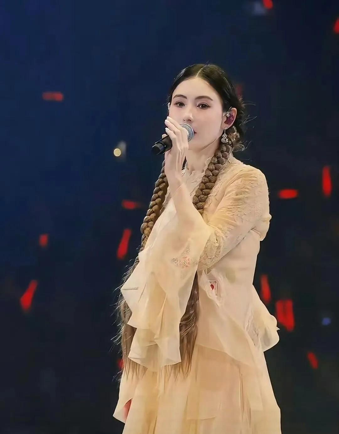 张柏芝助阵友人演唱会,金色麻花辫配蕾丝长裙,低头那一瞬间的温柔少女感十足,根本不