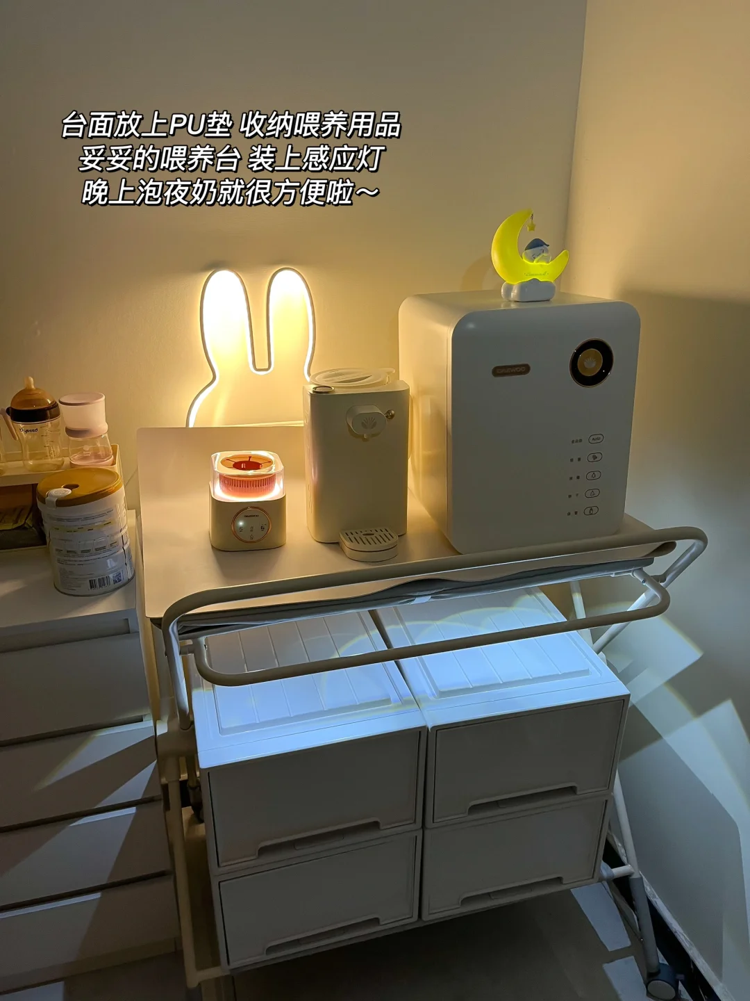 安全带可以反过来绑在台面上,垫上PU垫,放宝宝喂养用品,底部用抽屉收纳盒收纳宝宝日常用品,装上感应灯,泡夜奶很方便