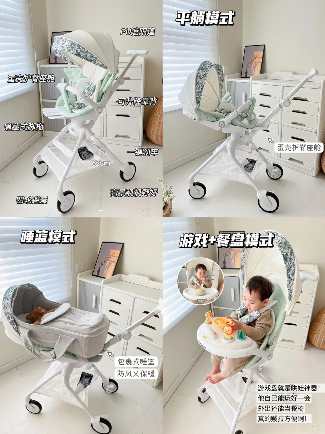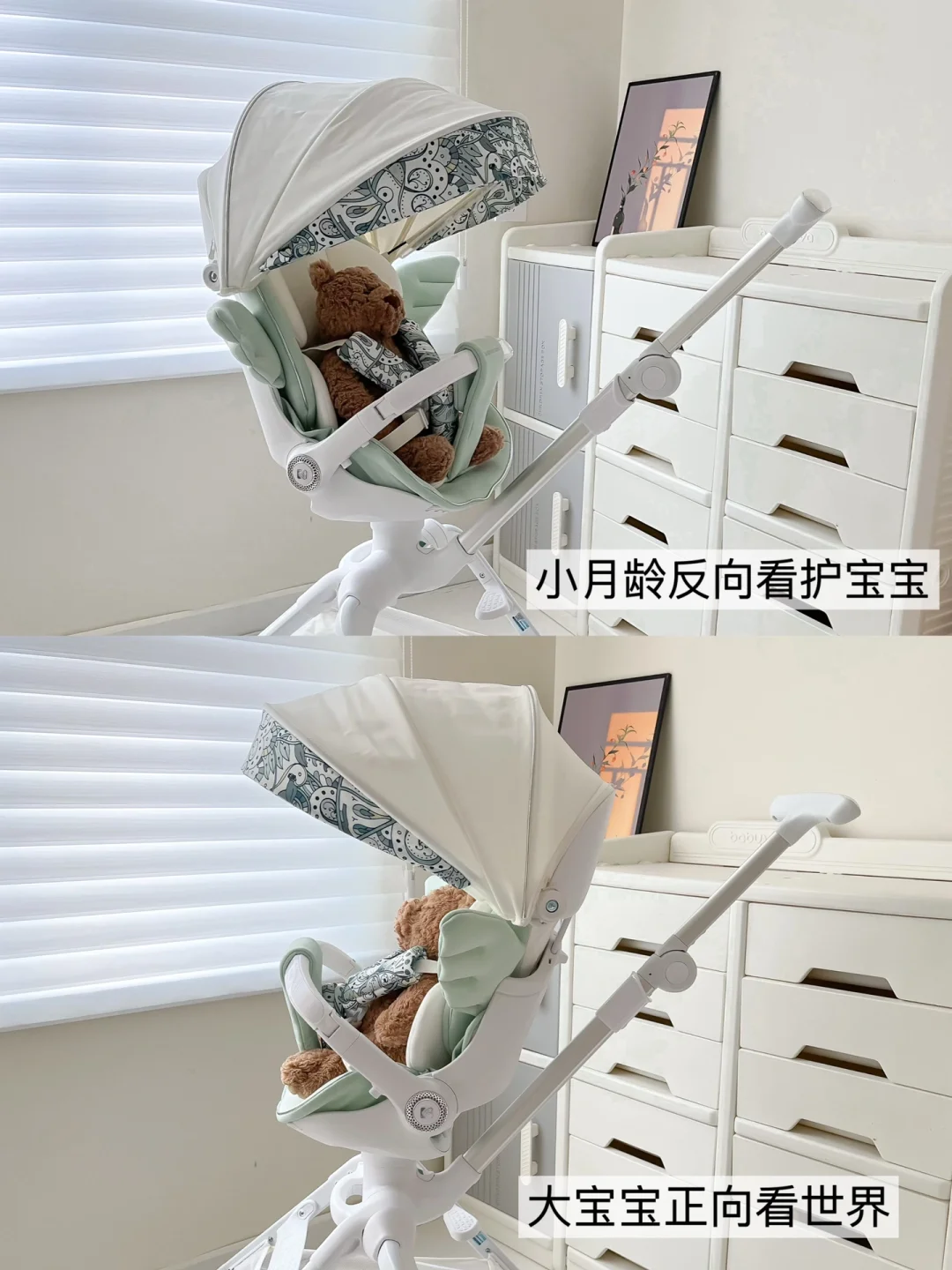 可坐可躺,它的蛋壳式护脊座舱很适合小宝宝,一体式的靠背很贴合保护脊柱,一键换向,双向推行看护方便,靠背可以三档调节,小宝宝包裹性更好,大宝宝也能坐直不会顶到头