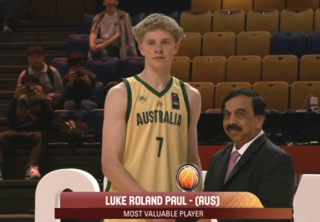 U16男篮亚洲杯决赛,中国男篮58-85负于澳大利亚男篮,获得本届赛事亚军。 赛后,FIBA官方评出了本届赛事的最佳阵容,中国男篮张子一(左一)和张懿赵杰(左二)入选。 其他三人从左至右依次为:保罗(澳大利亚,MVP)、汉密尔顿(澳大利亚)、凯特(新西兰)。 澳大利亚的保罗当选MVP,他今晚砍下26分10篮板9助攻。
