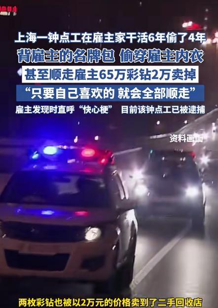 “家贼难防!”上海黄浦区,陈女士怎么也想不到,家里雇了6年的钟点工张阿姨,竟把她家当成了免费超市,从巧克力到奢侈品包包,甚至连价值65万的彩钻都敢偷,转手卖给首饰店老板只换了2万块 据海报新闻9月6日报道,在上海一位有钱人的太太偶然发现自己信任已久的阿姨,竟利用“蚂蚁搬家”的行为一点一点的自己的贵重的东西全部都偷偷拿走。 王太太(化名)的老公在上海做一点小生意所以家里面很有钱,她爱好就是经常购买很多昂贵的珠宝放在家里面最为珍藏品,然而就在今年六月的时候她发现自己最贵的两枚钻戒竟不翼而飞了。 这让她很是纳闷,家里面没有外人,而且家里的阿姨已经跟着他们家六年了相互之间都比较的熟悉,与比较信任,就没往阿姨身上想,就觉得肯定是自己又不知道放在哪里了。 就想着过几天不找的时候估计自己都出来了,不料在此期间家里面又少了很多东西,自己朋友出国的时候给她买的很多包巧克力自己一颗也没吃就没了。 这时王太太便对阿姨起了疑心,回到房间里面就将监控打开了,不料监控画面里的每一帧都在刺痛着王太太的心。 监控画面里面显示,自己家的阿姨趁着他们一家人出去旅游的时候竟然在她的衣帽间里面来回走动,而且还将自己的衣服全部试了一遍合身的直接当场就拿走了。 然而更令人吃惊的是,自己那两枚高达六十五万元的彩钻也是阿姨拿走的看到这王太太一肚子闷火觉得要是阿姨需要钱的话自己可以借给她,没想到她竟然选择这样下三滥的方法。 随后王太太就报了警准备利用法来维护自己的合法权益,随后警方找到这位阿姨的时候,阿姨见状没办了直接将所有的事情都如实说了出来。 说自己发现王太太买的东西太多了,少一两件衣服包包什么的根本就不发现不了,所以她干这么多年期间经常或偷偷拿去一些昂贵的东西出变卖。 随后也说那两枚戒指她并不知道那么贵,已经以两万的价格卖给了二手店了,说完之后便向王太太深深地鞠了躬,表达自己的歉意。 目前这名阿姨因涉嫌盗窃罪被上海检察院依法逮捕,随后等她来的就是一张判决书。