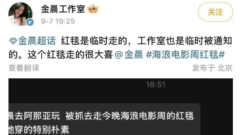 9月7日,金晨原本在阿那亚旅游,没想到临时接到通知让她去走红毯,于是她穿着自己日