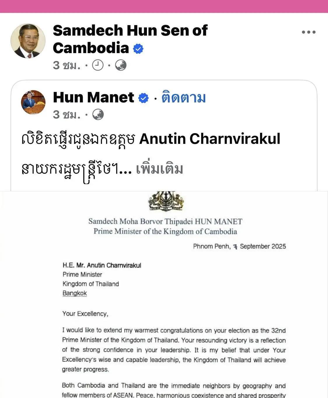洪森没有亲自祝贺阿努廷,而是转发其子洪玛奈给阿努廷的贺信对阿努廷当选泰国总理表示
