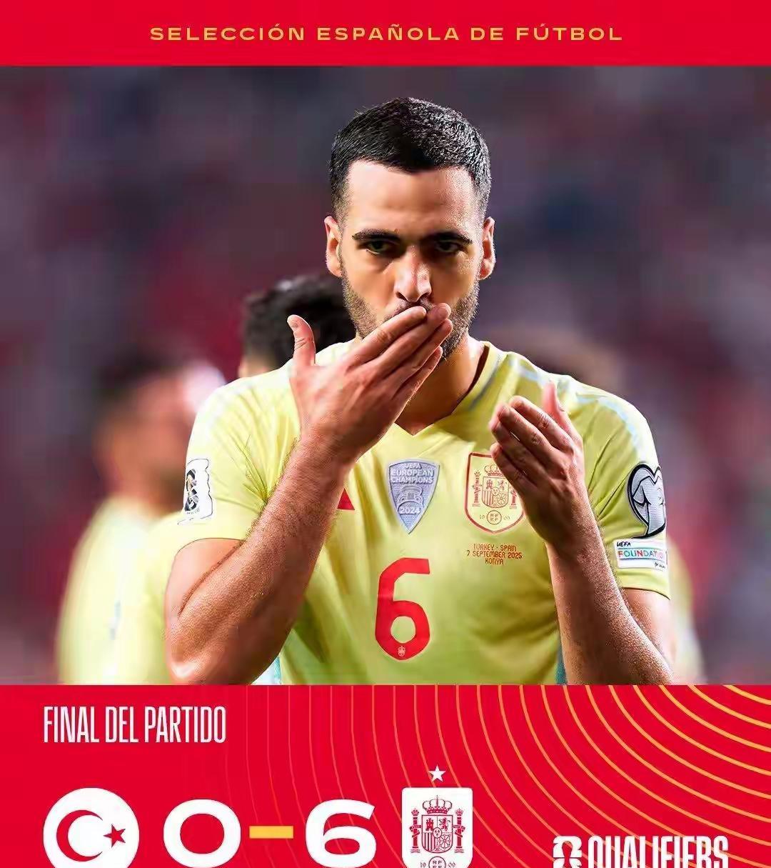 阿森纳中场大发神威!西班牙6-0血洗土耳其,这比赛真炸裂! 这事儿啊,得从9月8号凌晨说起,那会儿美加墨世界杯欧洲区预选赛,西班牙跟土耳其干上了,E组的焦点战,谁赢谁老大,你懂的。 结果呢,万万没想到,西班牙直接把土耳其给揍懵了,6比0,我的天,阿森纳那个梅里诺,帽子戏法,太狠了,佩德里也猛,俩球,还有亚马尔,助攻俩,巴萨那几个小伙子,真给力! 说白了,这场比赛之前,大家都觉得西班牙跟土耳其五五开,毕竟两队实力差不多,而且第一轮都赢了,谁赢了谁就能在小组里占个好位置,结果西班牙上来就一顿猛攻,根本不给土耳其喘气的机会。 你看啊,比赛才开始几分钟,西班牙就各种机会,威廉斯和奥亚萨瓦尔,轮番轰炸,可惜都被土耳其门将给挡出去了,但是没过多久,佩德里一脚远射,直接打破僵局,1比0,西班牙领先了! 土耳其那边也不甘示弱,立马反扑,有个叫埃尔马利的,差点就扳平了,还有个居莱尔,直塞球传的漂亮,结果阿克蒂尔克奥卢单刀中柱,你说气人不气人。 西班牙这边,那是越踢越顺,库库雷利亚传中,梅里诺冷静推射,2比0,接着佩德里又来事儿了,倒三角传球,可惜亚马尔一脚踢飞了,上半场结束前,梅里诺又进一个,3比0了,这下土耳其彻底没戏了。 下半场更夸张,西班牙完全控制了比赛,佩德里分球,亚马尔做球,费兰·托雷斯劲射破门,4比0,紧接着,梅里诺又来一个世界波,帽子戏法,5比0,最后佩德里也梅开二度,6比0。 这场比赛,西班牙赢得太漂亮了,继续保持连胜,小组第一稳稳的,接下来还有两场主场比赛,对手是格鲁吉亚和保加利亚,估计西班牙又要赢了。 对了,还有个事儿,西班牙现在正式比赛已经连续27场不败了,离队史纪录就差2场,真是厉害啊!
