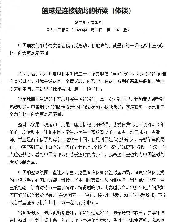 詹姆斯真有排面啊! 居然登上了《人民日报》 今日,詹姆斯的一篇文章,登上了人民日报了,这是正刊,这是官媒的高度肯定,这不再是一次简简单单的采访。 国家对于选择谁,不选择谁,刊登谁,发表谁,都是极度严谨的。正如勒布朗所说:“篮球不仅是一项运动,更是一座连接彼此的桥梁!” 《人民日报》作为中国最具权威性的媒体之一,极少直接刊发外籍运动员的署名文章。这是对詹姆斯个人影响力以及他传递的体育精神和友谊价值观的认可。 詹姆斯在文中提到的第15次中国行,以及他分享的跨越十多年的故事,都表明了他与中国球迷和篮球文化的长期、深厚联结,他来中国不仅是简单的商业访问。
