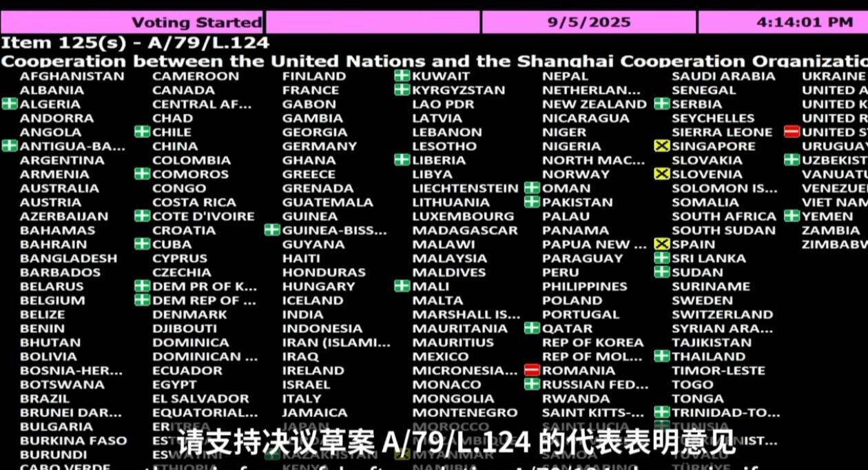 都谁投的反对票,弃权票,大家心里要有数。关于上合与联合合作。 反对票:美国、澳大利亚、保加利亚、加拿大、克罗地亚、捷克、丹麦、爱沙尼亚、芬兰、法国、德国、希腊、冰岛、爱尔兰、以色列、拉脱维亚、立陶宛、卢森堡、荷兰、新西兰、挪威、波兰、罗马尼亚、摩尔多瓦、瑞典、乌克兰、英国。 弃权票:阿尔巴尼亚、安道尔、奥地利、比利时、波黑、塞浦路斯、斐济、匈牙利、意大利、日本、列支敦士登、摩纳哥、马耳他、密克罗尼西亚、黑山、北马其顿、巴拿马、巴布新几内亚、巴拉圭、葡萄牙、韩国、新加坡、斯洛文尼亚、斯洛伐克、西班牙、瑞士、圣马力诺、缅甸。 27票反对,28票弃权、120票赞同。 滑稽的是投票是美国发起的。 美国第一个投的反对票,罗马尼亚随第二个投的反对票。摩尔多瓦最后时间马上结束投的反对票。 西班牙第一个投的弃权票,压力还是很大。新加坡居然紧跟着西班牙投了弃权票。 赞同票:阿尔及利亚、古巴、科威特、吉尔吉斯斯坦、马里、巴基斯坦、卡塔尔、斯里兰卡、泰国、特立尼达和多巴哥、突尼斯、也门毫不犹豫马上投了赞成票,非洲兄弟、东南亚、中亚、中东朋友关键时刻真上呀。只用了39秒120票赞同已投完,弃权票和反对票犹豫的时间比较长。