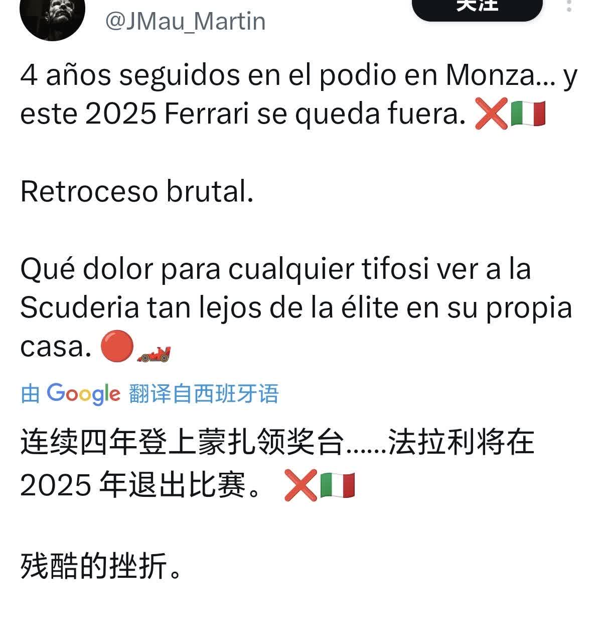 窝法煤烷!但铁佛寺伤心了[流泪] F1意大利大奖赛落下帷幕,主场作战的法拉利车队表现中规中矩,勒克莱尔不负众望归位,第四名完赛,汉密尔顿第六也算有所复苏! 尽管双车拿分,但意大利的法拉利车迷并不感到满意,其中一位车迷写道: “连续4年在蒙扎登上领奖台……但在2025年,法拉利缺席了。❌🇮🇹 惨烈倒退。 任何tifosi(法拉利车迷)看到Scuderia(法拉利车队)在自家主场如此远离精英集团,都会感到无比痛心。🔴🏎️”