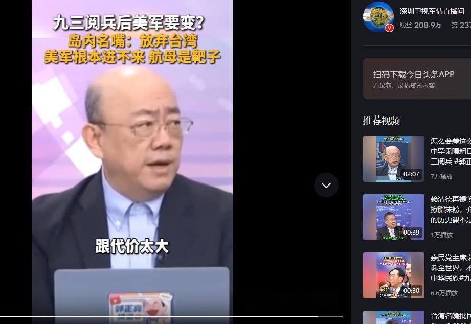 “九三阅兵后,美军将放弃台湾!美军根本进不来,航母就是活靶子!”近日,台湾名嘴郭