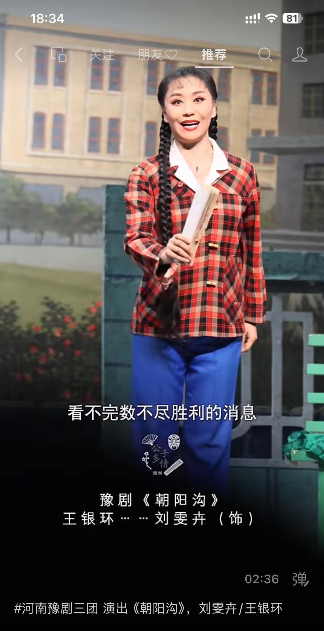 第四代银环扮演者刘文卉。 第一代魏云,已成为记忆,可圈可点。 第二代,印象一般。 第三代,杨红霞把银环演出新高度。 形体、样貌、唱腔,均一流。 现在号称四代的刘文卉,还在磨合中。 动作、唱功,距前辈还有距离。 朝阳沟,唱响几十年,实属不易。