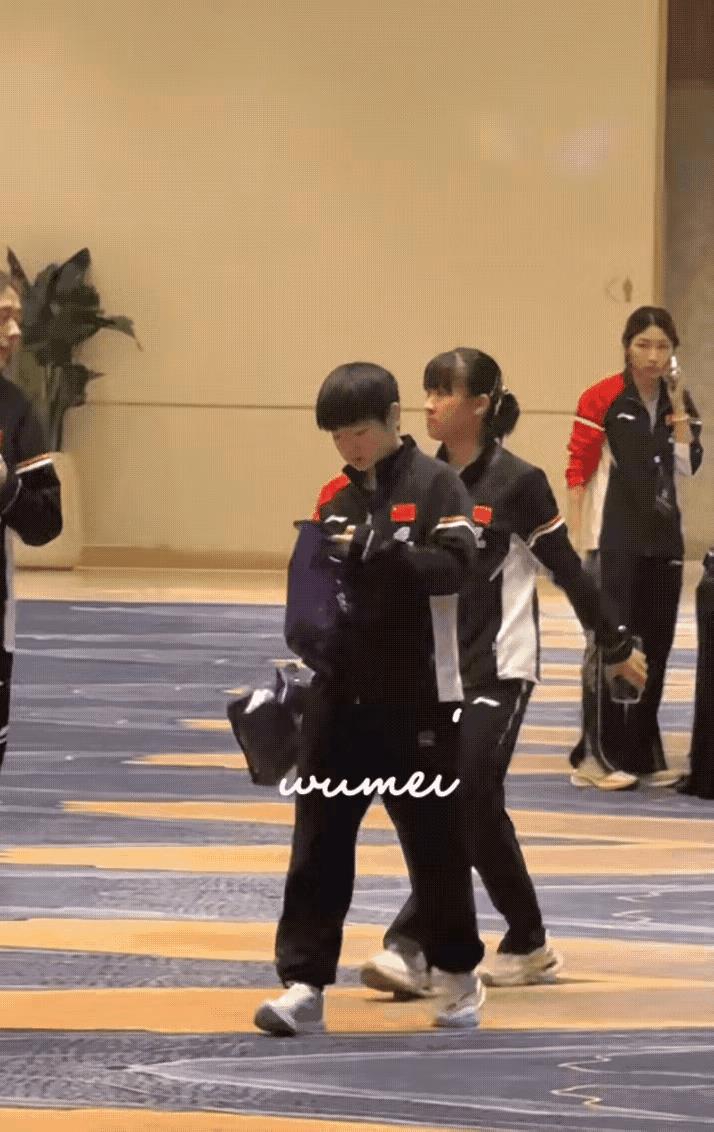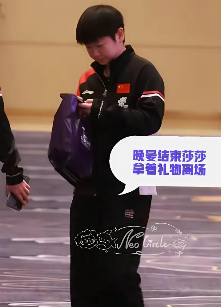 莎莎慢悠悠的带着小师妹去参加晚宴了,门口有签名的,莎莎没签就进去了! 由于上午澳门有暴风雨,国乒没上训,都去练体能了。 所以下午下训结束的晚,估计都饿了,直接进去了。 莎莎结束晚宴出来了,手里拿了个紫色的包,是伴手礼吧! 莎局确实忙,手机不离手,估计又有新商务了! 其实,国乒队的大部分队员都挺优秀的,又能扛旗,又好养活。