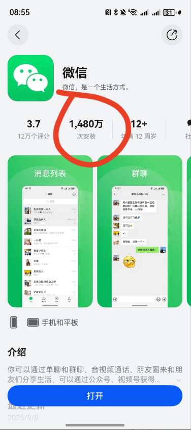发现一个小现象,想要知道鸿蒙5用户量,就看微信的安装量,大概差不多,我记得前不久公布了1400万用户,现在微信安装量是1480万,你说是不是?