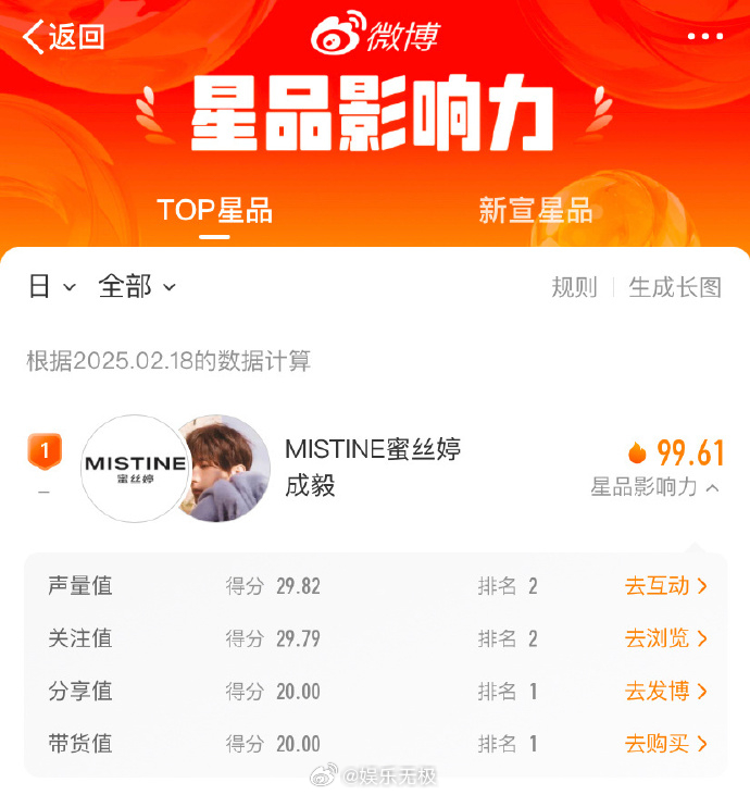 成毅星品影响力5次周榜夺冠 五次问鼎星品的周榜冠军,成毅以稳定的输出和极强的角色感染力,持续占据影响力高地!数据印证实力,作品定义演员,这份成绩单,含金量十足[哇]