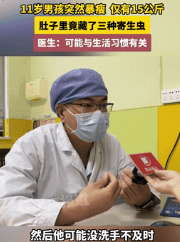 9月7日,河南郑州,一11岁男孩突然开始暴瘦,体重只有可怜的15公斤!父母感到不对劲,赶紧带孩子到医院检查,结果医生在男孩肚子里发现了三种寄生虫!在谈到病因时,医生的一番话让男孩父母感到后怕!网友:父母下次长点心吧! (信息来源:都市报道——河南郑州。三个月前,11岁男孩浩浩突然暴瘦,体重仅有15公斤,怎么吃都胖不了,家人到医院一检查才发现他的肚子里竟然有多种寄生虫) “11 岁仅 15 公斤” 这个数字,让不少网友直呼揪心,甚至有人质疑 “这是什么爹娘?孩子瘦成这样才发现,是没心吗?” 可在家长看来,这段时间的煎熬早已让他们身心俱疲。 这个男孩原本是出了名的 “小调皮”,可从今年春天开始,妈妈发现孩子像变了个人似的。放学回家后不再往外跑,吃饭时也只吃一点点。妈妈伸手摸孩子的胳膊,摸到的全是硌人的骨头,以前圆滚滚的脸蛋也凹了下去,眼窝一天天变深。 她夜里总忍不住起身去摸孩子的额头,看着孩子凸起的锁骨和瘦得像竹竿一样的腿,翻来覆去睡不着,为了给孩子补身体,妈妈每天变着花样做饭,可奇怪的是,孩子的体重不仅没长,反而一路掉到了 15 公斤。 “孩子比同龄孩子轻了快 20 公斤,得赶紧去医院查查!” 从那天起,家长就带着孩子踏上了求医路。他们先是去了家附近的医院,医生说可能是 “吸收不好”,开了些健脾的药,可吃了一个月还是没效果。之后又辗转去了市里的大医院,折腾了两个多月,检查单堆了厚厚一沓,还是查不出问题。 直到专家看了孩子的情况后,建议做个寄生虫专项检查。当检查结果出来时,夫妻俩都愣住了—— 孩子体内竟然有蛔虫、鞭虫等三种寄生虫。治疗时,看到孩子排出一条 13 厘米长的蛔虫,妈妈当场就哭了,既心疼孩子遭罪,又后悔自己没早点想到这个原因。 医生解释,这些虫子在孩子肚子里抢营养,吃再多补品也没用。鞭虫大多是通过粪口传播,估计是孩子如厕后没洗干净手,又用手抓东西吃导致的。 这件事传开后,不少网友质疑家长 “心大”。但了解内情的人都知道,夫妻俩这段时间没少为孩子操心,光是医院就跑了十几家,钱花了不少,每天都在焦虑中煎熬。家长并非没发现孩子的异常,只是一开始没往寄生虫方向想,加上多次检查无果,才耽误了时间。