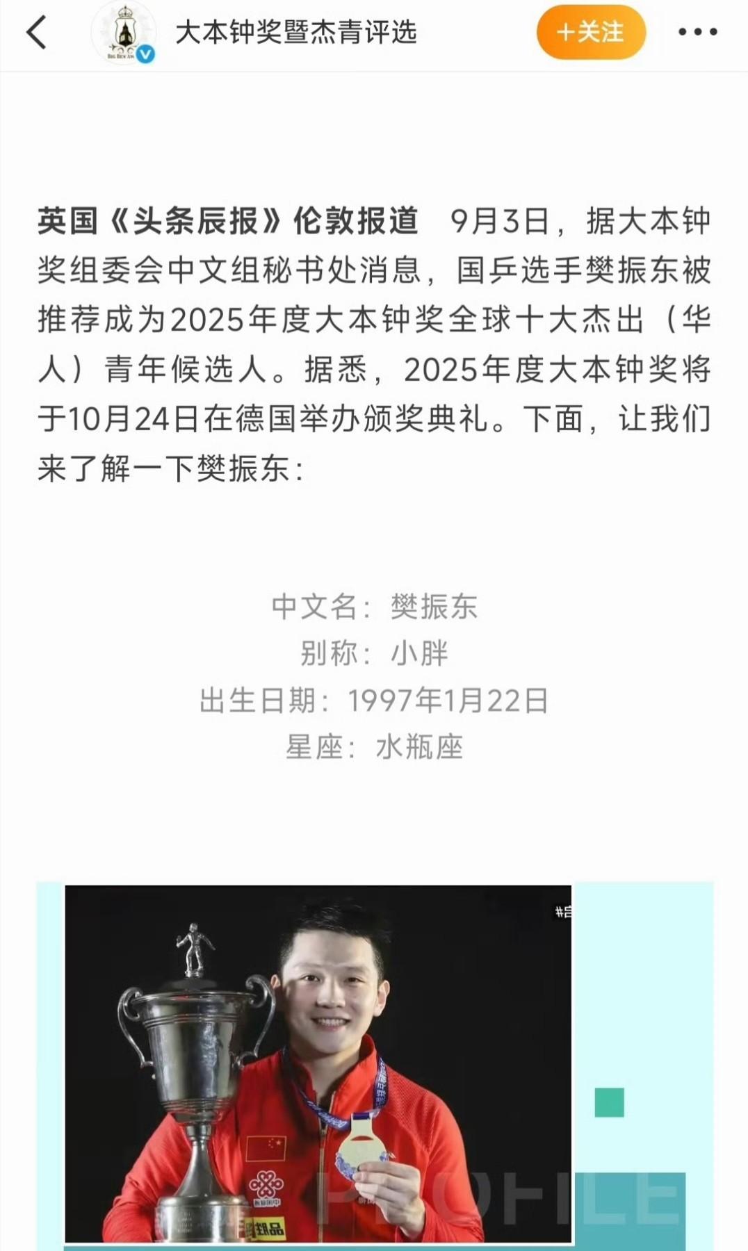 让人感到骄傲! 让人感到自豪! 樊振东入围2025年大本钟奖一一全球十大杰出华人