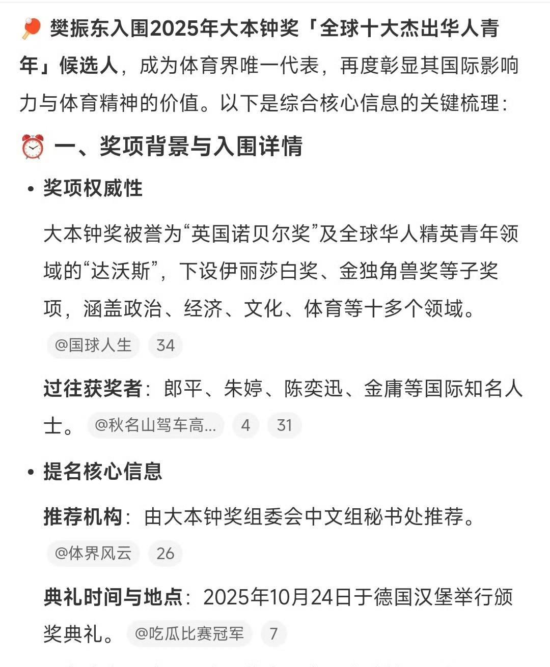 让人感到骄傲! 让人感到自豪! 樊振东入围2025年大本钟奖一一全球十大杰出华人青年候选人,成为体育界唯一代表! 樊振东以他的成就和国际影响力感动了世界!这个提名实至名归,祝福樊振东! 作为樊振东的球迷,为他感到无比自豪和骄傲!
