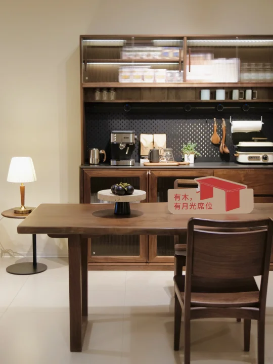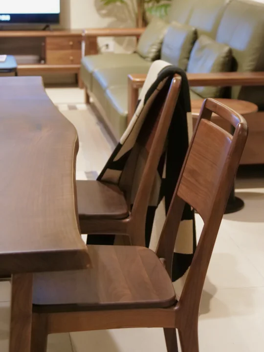 环绕餐桌的莫奈椅,高靠背的弧线很显利落,坐下后背被稳稳托住,腰背有了依靠的放松。同样的FAS级黑胡桃木材质,木质的支撑坚实,温润细腻的触感,椅面的设计贴合身体,无需靠垫也能坐的稳。流畅的线条带着复古气息,和大板桌一同构建出实用又从容的餐厅氛围,复古味十足。
