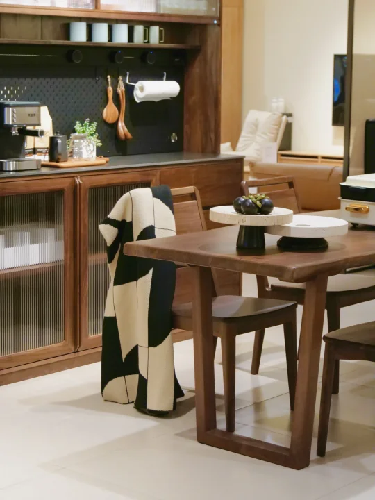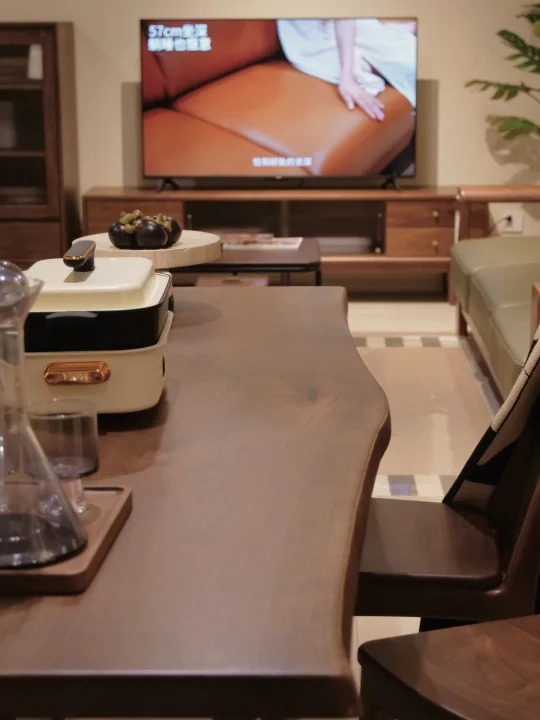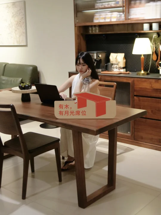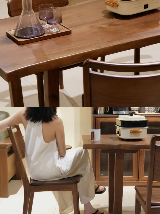 桌子本身十分有分量,厚实木框与扎实拼接,纯实木的宽大桌面,不必担心日常使用的稳固性,能稳稳托住三餐四季的幸福烟火,哪怕是多人围坐聚餐、摆放重物,都始终稳当。