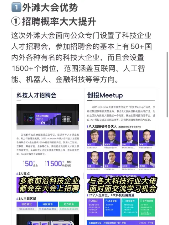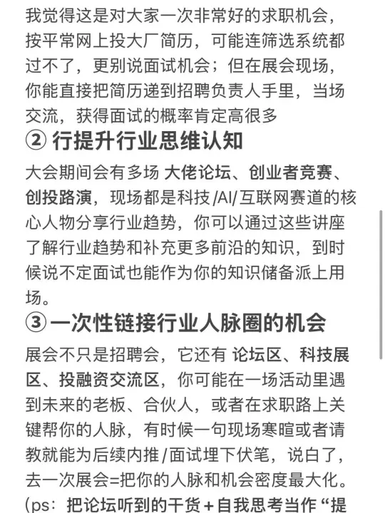 在外滩大会的论坛区、科技展区、投融资交流区,你可能会遇到未来的老板、合伙人,或者在求职路上关键帮你的人脉,有时候一句现场寒暄或者请教就能为后续内推/面试埋下伏笔,把你的人脉和机会密度最大化。