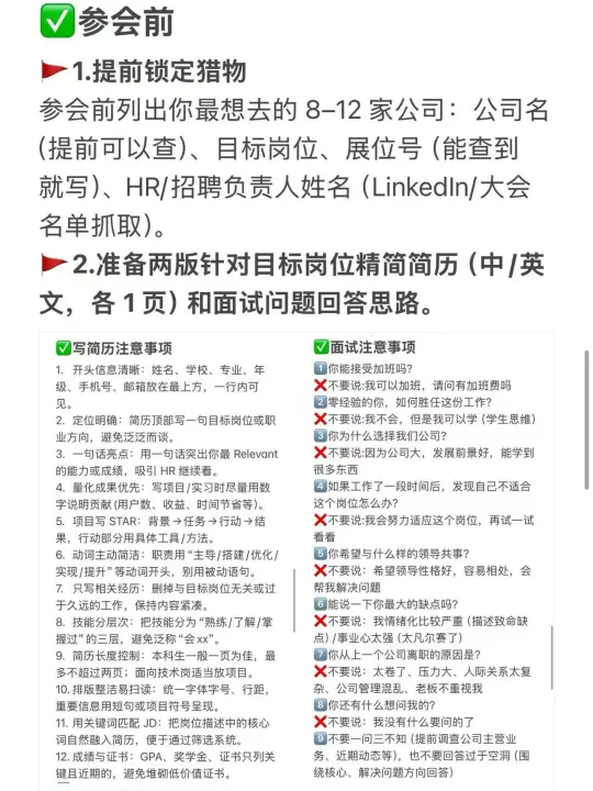 参会前列出你最想去的 8–12 家公司:公司名(提前可以查)、目标岗位、展位号(能查到就写)、HR/招聘负责人姓名(LinkedIn/大会名单抓取)。