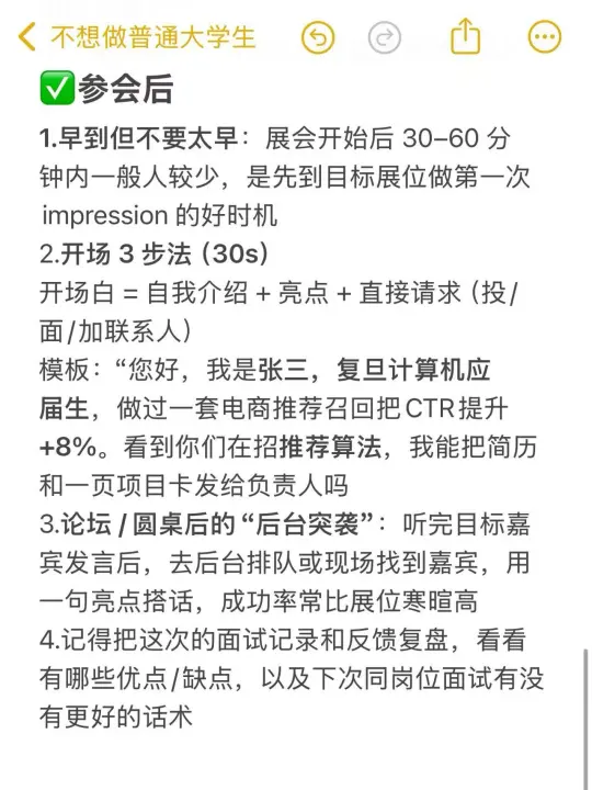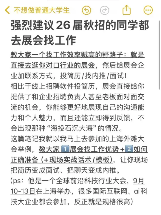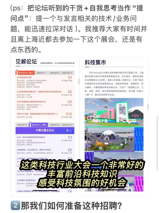 这篇笔记我就以我马上去参加的2025 Inclusion·外滩大会举例,教大家1️⃣展会找工作优势+2️⃣如何正确准备如何正确准备(+现场实战话术/模板),让你现场把简历变成面试、把聊天变成内推。