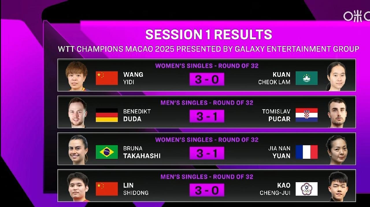 上午场8场比赛全部结束,男单女单各产生16强中的4个席位。 男单16强:林诗栋、雨果、阿鲁纳、杜达 女单16强:迪亚兹、王艺迪、朱雨玲、高桥布鲁娜 具体战况如下: 国乒黄友政遗憾出局!