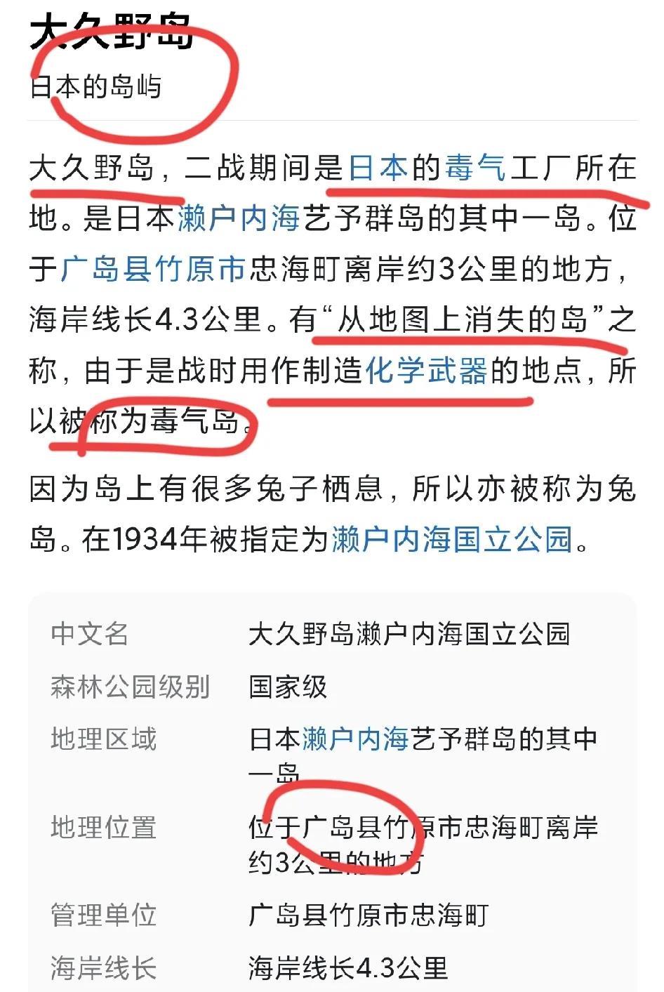 坑害中国人的日本小岛,摇身一变成为了游客心中“美哭了”的著名治愈景区! 这个大久野岛在小红书上有大量的游玩攻略,很多人分享游玩感受,都是“超级治愈”、“幸福”、“超级可爱”等主观描述。却很少有人知道,这岛与中国有非常大的渊源。 当年日本侵华的很多武器来自这个岛,更需要记住的是大部分“化学武器”都来自这个岛!当时地图上是抹去了这个岛的信息,就是为了掩盖罪证!岛上生产的毒气九成去了中国战场。 很多中国人去大久野岛是为了看岛上的兔子,但是这些兔子,很可能也是当年岛上毒气实验室遗留存活下来的兔子的后代子孙,懂历史的人不会觉得那里是治愈的岛,是美哭了的岛。那是一个曾经罪恶的岛,如今摇身一变成了很多中国人“幸福”的代名词,让人细思极恐。 要去大久野岛的游客,是他们的自由,但是最好记住历史再去体验。