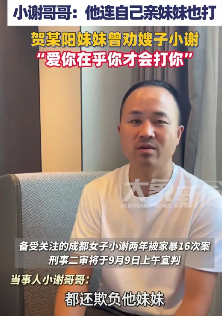 实际上,贺某阳的家暴不只是对妻子,看亲妹妹不顺眼时也会直接开打。不知是频繁被打产生了畏惧,还是自小价值观被扭曲,亲妹妹觉得这挺正常,还用“打是亲骂是爱”、“爱你在乎你才会打你”来劝慰嫂子小谢。