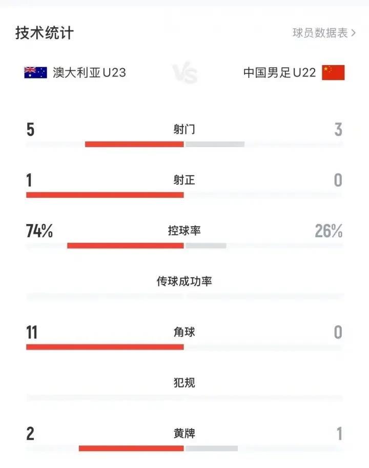 致敬:中国U23男子足球队! 比赛场面完全被压制,却赢得全国球迷的尊重和掌声! 中国男足小组赛第三轮对阵澳大利亚技术统计: 射门3-5,射正0-3,角球数0-11,控球率26%-74%,场面被动沉闷,枯燥无味,比分0-0却是我们最想要的结果。 三战两胜一平,积7分,进12球失1球,小组第二顺利晋级明年1月份在沙特举行的U23男子足球亚洲杯决赛圈。 请记住他们的名字: 主教练:安东尼奥.普切 球员:10号王钰栋、9号拜合拉、14号杨皓宇、20号李镇全、6号徐彬、19胡荷韬、21汪士钦、5号刘浩帆、5号彭啸、4号吾米提江.玉苏普、16号李昊、1号于金永、2号杨希、3号张一轩、7 号向余望、8号陈哲宣、11号删纪闻、12号霍深坪、13号希尔扎提.努尔、17号鲍世蒙、18号朱鹏宇、22号毛伟杰、23号李新翔。 明年1月份沙特决赛圈再见,相信你们一定能带给中国球迷惊喜!