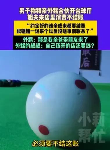 河南许昌,男子和亲外甥合伙开台球厅,他出资45,000元,外甥出18,000元,两人约定好,谁的亲朋好友来都要付款,结果男子的姐夫,也就是外甥的父亲,带朋友来消费了几十元,却没有给钱,男子就找外甥,外甥说,那是我亲爸。男子又找姐姐,姐姐却说, 以后没啥事不要联系。最让男子不舒服的是,外甥的叔叔说,自己孩子开的店要什么钱? 郑先生早就看中了一个地方,那里非常适合休闲的人们,在那里开一个台球厅,他觉得应该生意不错。 正好他和外甥都爱打台球,他跟外甥说了这么一件事,外甥非常欣赏他的眼光,马上支持自己的舅舅。 就这样,郑先生和外甥一拍即合,两人决定合伙在这里开一个台球厅,毕竟两个人手里的钱都不多,合起来刚刚好。 郑先生出了大头,他一共投资了45,000元,他的外甥钱不多,就投资了18,000元。 毕竟都是在熟人比较多的地方开台球厅,郑先生和外甥都商量好,以后碰到熟人,不管是谁的亲朋好友,都要付款,亲兄弟要明算账。 郑先生的外甥当时也是点头,觉得这是一个不错的建议,毕竟他们俩的亲朋好友有不少是爱好打台球的。 两人商量好,台球厅开张之后,一切都有序进行着,台球厅的生意确实也不错,两人合作很愉快,直到郑先生的姐夫出现,他和外甥一家人反目成仇了。 郑先生的姐夫就是他外甥的父亲,那天,郑先生姐夫带着朋友来到台球厅,一来就是一副主人的架子,吆喝着朋友们玩得开心。 郑先生知道,这个台球厅虽然是他和外甥合伙开的,这个姐夫多少支持了他的儿子。 所以看着姐夫在这里,他也不说什么,毕竟大家都是亲戚,只是郑先生多少有些担心,到时候如果姐夫不结账该怎么办? 果然,他的姐夫和朋友们玩尽兴之后,就扬长而去了,没有付款。 因为姐夫是外甥的父亲,既然是外甥的父亲没有付款,那他就找外甥解决这件事,结果外甥跟他说:“那是我爸,他们打了不到半小时,自己家的店,怎么好意思让父亲付钱。” 郑先生一看外甥拎不清,他就找到姐姐,希望姐姐能给一个合理的处理态度。 结果姐姐很生气,她跟郑先生说:“以后没有啥事,就不要联系了。” 姐姐的言外之意就是,郑先生格局小了,自己的姐夫,还要给什么钱。 姐姐的态度让郑先生很生气,其实郑先生在乎的不是那几十元,他在乎的是姐姐能够公平的对待这件事情。 毕竟他和外甥已经约定好,不管是谁的亲朋好友,都是要付款的,既然是约定的,那么就要说到做到。 但是现在姐夫开了个头,他不但不给钱,现在还整个郑先生姐弟俩反目成仇,他对外甥也有了意见。 他担心以后外甥再遇到这种事情,又是一笔糊涂账,大家都那么多亲朋好友,如果他们过来玩都不收钱,那这台球厅也就开不下去了。 所以他找来调解员,要将这件事摊开来说,结果外甥的叔叔说:“自己来自己家孩子的店,还要什么钱!” 他说这没有什么好纠结的,他们的言外之意都让郑先生不要纠结这些小事。 郑先生心里就是不舒服,他毕竟是和外甥合伙的,如果以后还发生这样的事情,他们的糊涂账会越来越多。 那么该如何看待合伙的事情呢? 首先,合伙关系要亲兄弟明算账。 《民法典》第969条规定:合伙人的出资、因合伙事务依法取得的收益和其他财产,属于合伙财产。合伙合同终止前,合伙人不得请求分割合伙财产。 这明确了合伙财产的性质和归属,以及合伙人在合伙合同终止前对合伙财产的权利限制。 其次、郑先生和外甥是合伙合同关系,那么彼此都要履行合同义务。 《民法典》第970条规定:合伙人就合伙事务作出决定的,除合伙合同另有约定外,应当经全体合伙人一致同意。合伙事务由全体合伙人共同执行,或者按照合伙合同的约定或全体合伙人的决定,委托一个或数个合伙人执行。 既然是合伙关系,那么双方就应当遵守约定。