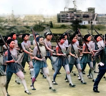 这是1937年日本东京高中的女生在学习步枪和刺刀的基本战斗技能。她们身穿统一的学生服,手持上了刺刀的步枪进行严格的训练。为了侵略,日本早已对学生进行严格的军事化训练。 日本的学生从小学生就开始严格训练作战要领与战术。小学生们虽然使用的并非真正的武器,但训练的步骤都是按照军队中的军训进行的。 高中的学生开始使用真正的武器进行军事化训练。不论男生还是女生都要接受严格的军训。许多学生到了高中已经能熟练地使用枪支并且具备作战能力。尤其男生可以直接进入部队参战。 日本许多学生参加部队经过战场实战训练后能很快练就百发百中的枪法,且将学习的战术灵活运用于战场上。这也是当初日本侵华时,中国军队屡屡吃亏的原因之一。抗战中后期,中国军队才真正摸透日军的战术与战略,反败为胜,终将日军赶出中国。