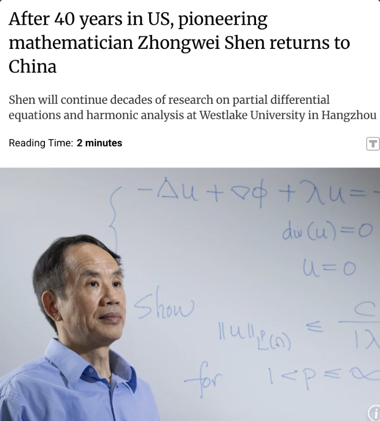 外媒:著名美籍华裔数学家申仲伟离开美国,前往中国杭州的西湖大学担任讲席教授。