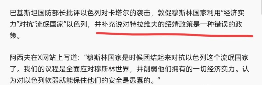 阿西夫称,巴基斯坦是一个经济脆弱的国家,但该国政府意志坚定,感谢真主,其英勇的专业武装部队与规模是其五倍的印度展开了较量,并给了他们一个教训。没有人为你保证安全。外界的帮助很重要,但无敌来自于内心。很显然,面对以色列对卡塔尔的袭击,巴基斯坦第一时间就站出来声援卡塔尔,并把矛头对准了以色列。