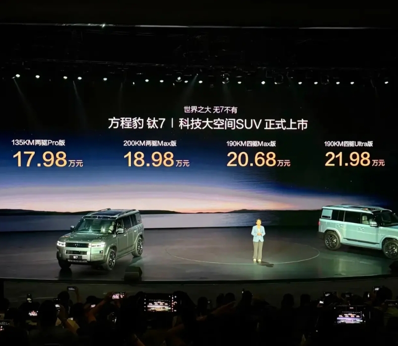 “钛7”,这台名字在粤语地区是骂人的车,终于公布售价,17.98万起售。 信我,直接冲顶配就完事了。 售价诚意是有的,毕竟比亚迪要冲量冲高端。 一台方程豹风味的唐DM-i,是专门给不喜欢唐外观,而且非比亚迪车不买的客户准备的。 那些拿豹5,豹8比较价格的人也是搞笑,城市通勤suv和正儿八经的越野车,比什么?