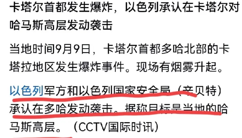 有仇不报非君子 没有什么能够阻挡以色列打击哈马斯的决心,掘地三尺都要把哈马斯找出来灭了。 哈马斯高层躲在卡塔尔,以为有卡塔尔财团保护会躲过以色列追杀。 岂料,以色列胆大包天根本不把卡塔尔放眼里。以色列眼里只有仇人哈马斯,此刻以色列杀红了眼,对着卡塔尔首都一处哈马斯高层藏身点一顿狂轰滥炸。 尽管卡塔尔方面说哈马斯人员不在此也无人员伤亡,但以色列宁可错杀一千不放走一个。