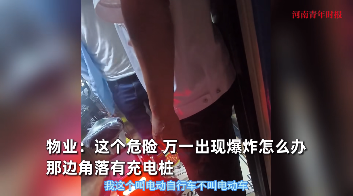事发当天,这位业主推着电动车进了电梯后,准备到楼上给电动车充电,而物业人员看到后立刻就把他拦了下来,解释说电动车推上楼很危险,在家里充电更是非常不安全。