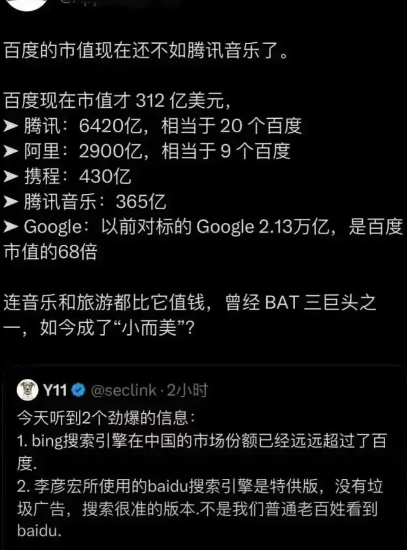 大家都在嘲笑百度和李彦宏,说什么百度在各个领域都是起了个大早,赶了个晚集,说得好像百度李彦宏有多弱智似的,我的感觉恰恰相反,甚至反倒觉得李彦宏应该是一个真正看穿世态诸事通透的高人,不信看看那些在风口浪尖刀光剑影的互联网大佬,哪个不是焦头烂额心力交瘁未老先衰。 再看看百度李彦宏,人家永远是温润尔雅心平气和气宇轩昂,不争波涛汹涌,只求绵绵不绝,快60岁的人硬是活得像个追风少年,李彦宏的聪明在于他不仅是个企业家,更像一个修行者,人家早已看穿了钱财这东西,身外之物,空洞数字,争太多搞不好还会惹来一身麻烦,小富即安就挺好,聪慧让他在各领域都能起个大早,智慧让他在各领域都只赶个晚集,游艇飞机豪宅沙滩,人家都有了,人生一世,草木一秋,夫复何求呢?