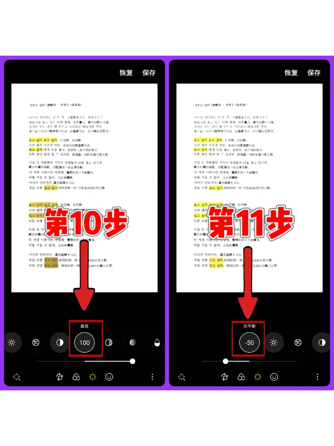 7️⃣选择调色板:把光平衡调(-100)、亮度调(100)、对比度调(100)、高亮调(100)最后再把光平衡拉到(-50)