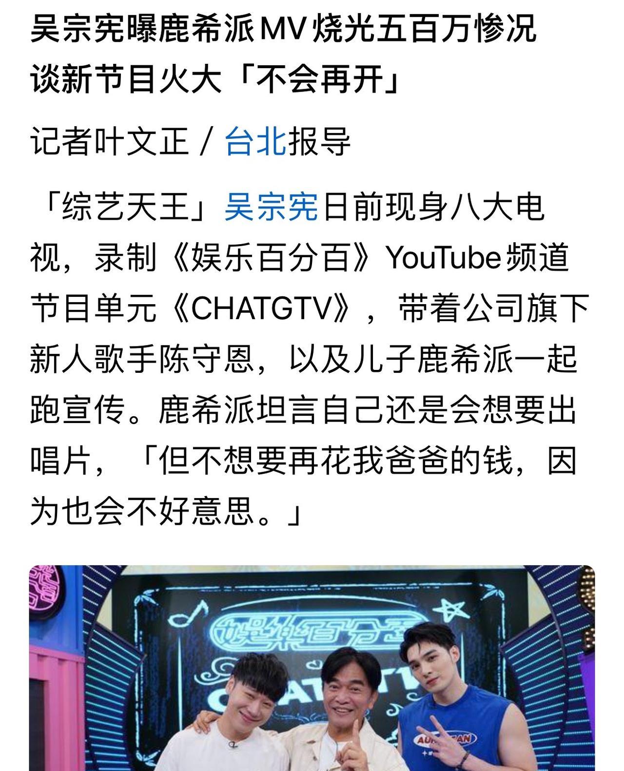 吴宗宪终于露面了! 他的直播间已经停播一个多月了! 他这一次现身是为了儿子和公司签的信人! 吴宗宪现在是铁了心的想把儿子捧出来!奈何鹿希派实力有目共睹烂泥扶不上墙啊?上一次砸了老爹五百万拍的mv惨淡收场…… 这一次一同参加栏目透露,自己还想再尝试一次,但是不好意思再花吴宗宪的钱了!自己会另想办法…… 现场有记者问对于最近爆出的s妈具俊晔联手继续诉讼怎么看? 吴宗宪直接摇头:人家的家事不要来问我啦……选择了拒绝回答! 看来吴宗宪吃一堑长一智啊,上一次说小s没家教刚刚平息下去!他可不想因为自己的大嘴巴再惹来麻烦!