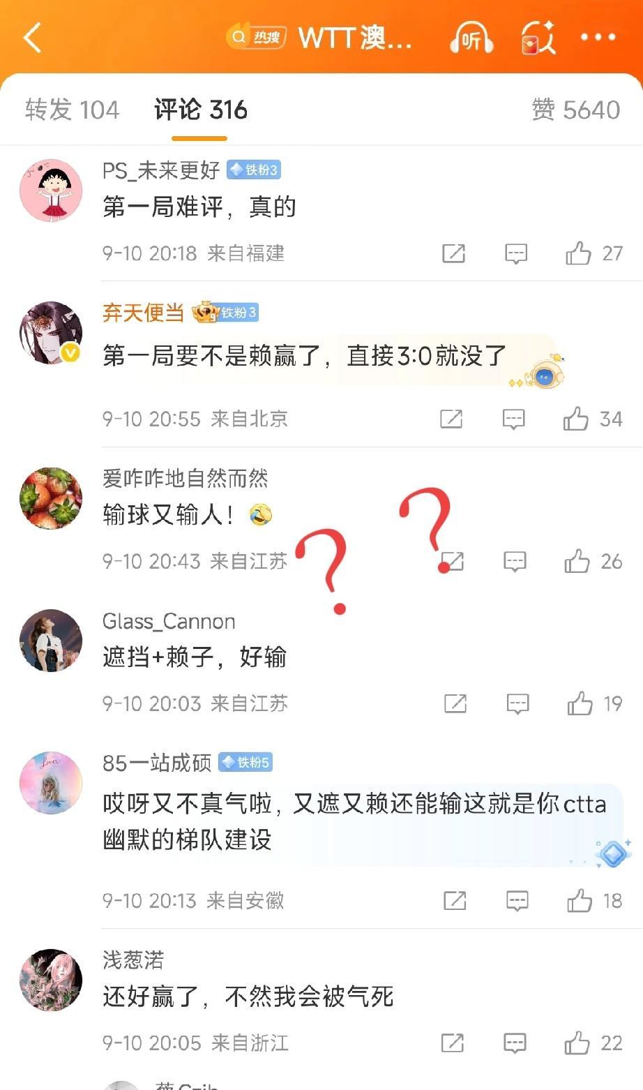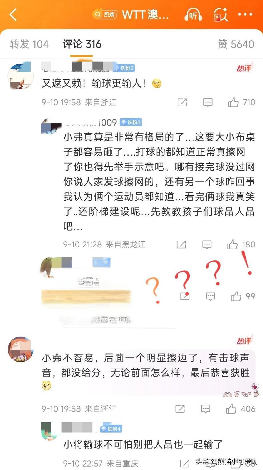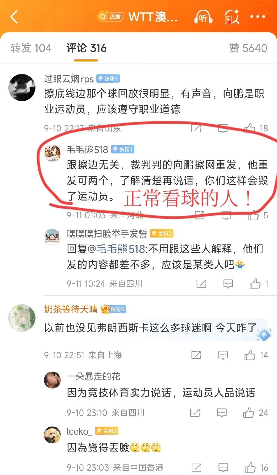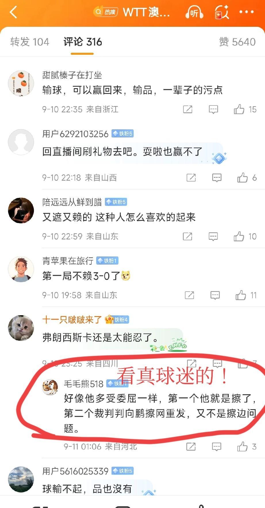 真是活久见,第一次见到某个群体因为外协网暴国乒队小将的!!他们统一话术就是将争议球污蔑成小将赖球,说球品有问题!场上不是有裁判吗?擦网重发不是裁判判的吗? 在WTT世乒联的微博,向鹏与弗朗西斯卡比赛赛果报道的微博下面的评论,绝对可以用一言难尽来形容。统一的话术真的颠覆认知! 如果不是评论区基本都是中文,会给人恍惚觉得向鹏是“外国”运动员!!仿佛他们就是裁判,就是主宰一样! 实话说向鹏2-3弗朗西斯卡,很可惜,看他打球是小将里面比较有血性和积极的了,他是与龙队一样的正手体系,希望他能冲出来,捂住耳朵向前冲,狠狠的练,集体队伍需要! 希望国乒小将们都加油!![加油][加油]