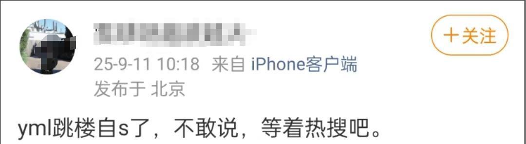 网友曝于朦胧跳楼细节!反锁房门弄开纱窗凌晨被发现,近照暴瘦。 9月11日一则关于艺人于朦胧坠楼身亡的消息,瞬间在网络上激起千层浪。 最初只是零星的传言,但很快就有了让人心头一沉的“实锤”。 狗仔队的消息来得又快又具体,直指一位演过《三生三世十里桃花》、粉丝数超过两千万的男演员,事发地点在北京,时间是凌晨。 这几条线索几乎都精准地指向了于朦胧。 更早些时候,一个IP在北京的网友用缩写“YML跳楼自S”发布了消息,预言将有大事发生。 而在他个人社交平台的评论区,一位四川的粉丝留下了一句令人心碎的话:“他已经去天堂了”。 事件的细节被一点点拼凑起来,据说事发前一晚,也就是9月10日,于朦胧还在家里招待朋友,气氛似乎并无异常。 宴席散去,到了11日凌晨两点多,他回到自己的卧室,还把门给反锁了。 几个小时后大约清晨六点,准备离开的朋友们却怎么也找不到他。 最终悲剧性的一幕发生了。朋友们在楼下的草坪上发现了他,当时一位遛狗的邻居也目睹了这番景象,并随即报了警。 现场有两个细节让人百思不得其解,一个是警方发现,卧室的纱窗有一个被抠开或弄破的小洞,另一个则是于朦胧的身上竟然带着朋友的两块劳力士手表。 警方很快给出了初步结论,排除了他杀的可能,但究竟是什么导致了这场悲剧,具体原因仍在调查之中。 公众的目光随即转向他近期的状态,试图从中找到一些蛛丝马迹。 他的社交账号IP确实在北京,但动态却停在了十多天前,这和他以往大概一周一更的频率完全不符,显得很不寻常。 翻看他最近的照片,很多人都感觉到了不对劲。 他瘦得有些脱相,脸部轮廓分明,鼻子显得特别大,连脖子上的骨骼都清晰可见。 这种瘦已经超出了艺人为上镜好看的范畴,更像是一种不健康的状态。 他最后分享的一张照片,是眺望远方的侧影,眼神里读不出具体情绪,像是在放空,又像心事重重。 关于他性格的讨论也浮出水面,于朦胧自己就说过,他性格内向且敏感。 他曾坦言失恋时会一个人躲在家里哭,不想见人,靠听歌来慢慢消化情绪。 他似乎很容易将外界的负面信息与自己关联起来,整个人呈现出一种悲观和精神内耗的倾向。 有未经证实的消息说,他曾受抑郁症困扰。 这样的性格确实让人担忧他会做出极端的选择。 事业上的不顺或许也是压在他心头的一块巨石,此前一直有传闻说他被“雪藏”了三年。 关于原因有两个版本,一是说他拒绝了某位女投资人,另一个则指向老东家天娱的资源分配问题。 尽管所谓的“雪藏”期间他并非完全消失,依然有作品播出,也换了新公司,但工作量锐减是不争的事实。 2023年他以一部《一伞烟雨》宣告复出,然而复出后的他状态并不好。 在拍摄现场,他给人的感觉是疏离和畏缩的,就连笑容里都透着一股不自信,脆弱感几乎要溢出屏幕。 至今传闻沸沸扬扬,但他的团队仍未有任何官方回应。 无论真相如何,这都是一个令人无比痛心的消息。 大家都在焦急地等待一个确切的说法,希望能给关心他的人一个交代。