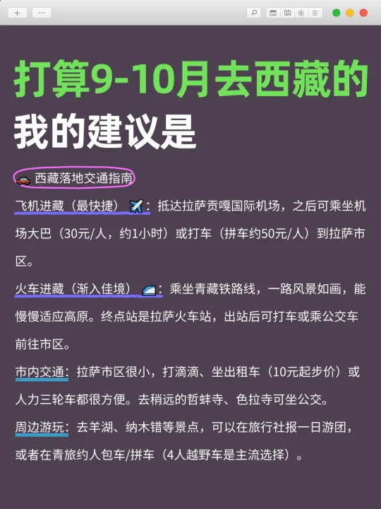市内交通:拉萨市区很小,打滴滴、坐出租车(10元起步价)或人力三轮车都很方便。去稍远的哲蚌寺、色拉寺可坐公交。