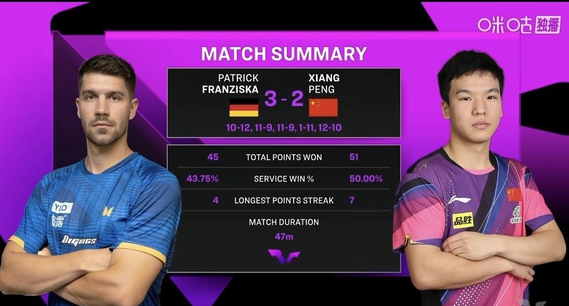 WTT澳门冠军赛,向鹏2:3不敌弗朗西斯卡。这场球真的太可惜了,决胜局2分惜败。
