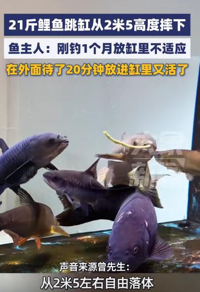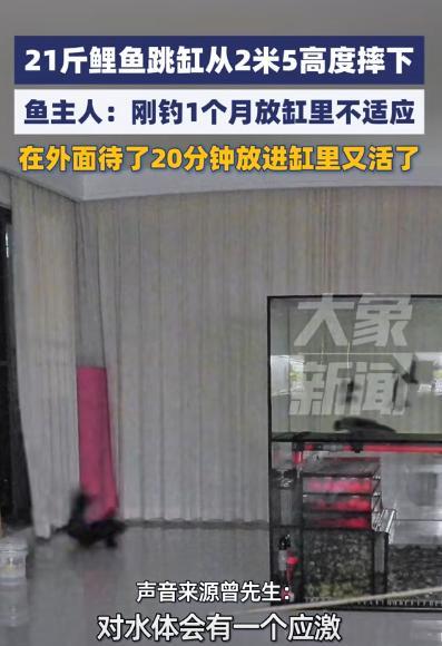 活久见!9月8日,湖南怀化,一男子将钓到的21斤大鲤鱼带回家饲养,结果鱼应激了,跳出了鱼缸!从2.5米的高度重重摔在地上,随后又在地上待了20多分钟,等到男子回家时已经没有了动静,没想到将鲤鱼放入鱼缸后不久,它又活了过来。网友:古人诚不欺我,金鳞岂是池中物! 据大象新闻9月10日报道,一条约十二公斤重的鲤鱼竟然自己“飞”出了鱼缸,看到这一情景引发了引广大网友的调侃,说这条鱼是为了逃离鱼缸的“苦海”才这样做的。 事情的起因是,老王(化名)是一个钓鱼爱好者,但他已经很长一段时间都没钓出来过鱼了,然而那天他和朋友去河边钓鱼消遣时光的时候。 突然发现自己的鱼竿特别重,随后老王就觉得是钓到了一条大鱼,于是就赶紧将自己的鱼竿一点一点的收回来,看到钓出来的东西的时候1,老王一整个都震惊住了。 竟然是一条超级大的鱼,随后老王回家称了称发现竟然有二十斤重,看见这么大一条鱼老王舍不得吃,于是就将鱼给放进了自己家的鱼缸。 随后每天老王都会悉心的照顾鱼儿,很快一个多月都已经过去了,鱼儿也被老王养的很好直接胖了一斤多,然而那天老王回家的时候竟然发现这条鱼竟然直接躺在地上。 这时老王直接就愣在了原地,等缓过神之后就赶紧上前看看鱼的状况怎么样了,不料鱼竟然不会动了,这时吓得老王赶紧看看鱼还有没有呼吸。 随后感受到呼吸之后就赶紧将鱼放回了鱼缸里面,过了好大会之后,鱼儿在鱼缸里面就又能活蹦乱跳了。 老王就赶紧查看监控,后来发现鱼是自己飞出来的,而且距离他发现的时候鱼儿就已经在无水的环境到了二十分钟了。 看到这之后老王觉得这这条鱼真的太神奇了,于是就发布到了短视频平台上面,不了却引起了广大网友的喜欢,有一些网友在下面说,鱼是不是被摔出来脑震荡,当时不会动了。 也有一些网友在下面留言调侃说,老王将人家从自由自己在环境换到这样一个憋屈的鱼缸里面,这条大鱼是想要追求自由了,此外还建议说让老王实在不行给人家弄一个单独的鱼缸,和小鱼生活在一起太挤了。