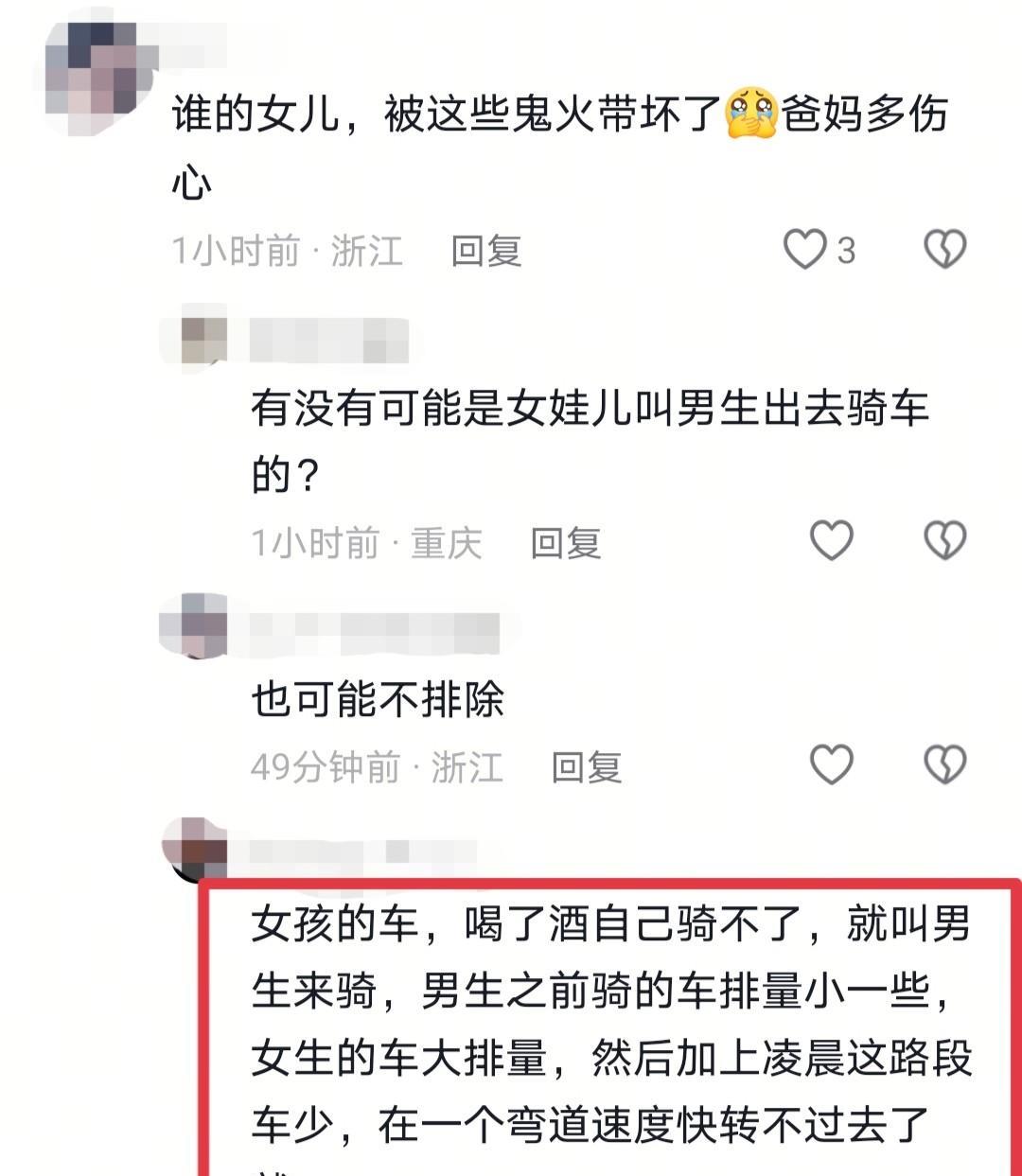 重庆摩托车祸死亡的一男一女都很年轻,车子原本是女生的,但因为喝了酒骑不了,便让男生来驾驶,谁知因为不熟悉车辆和路况,又盲目追求刺激,这才断送了2条无辜的性命! 事情发生在9月10日凌晨2时40分的重庆江北,这个点原本应是夜深人静、万籁俱寂,可一场突如其来的车祸将其打破。 只见一辆摩托车倒在路边,一名女子趴在护栏上,另一名男子躺在地上。据知情人透露两人年龄都不大,发生车祸后当场死亡,女生受伤非常惨烈,连脊椎都断了。 他们所走的这条路是跑山的必经之路,经常有摩友骑车路过,不过也有大车驶入,路面状况不太好,坑洼、碎石、减速带,摩托车高速行驶压弯,很容易被这些因素影响而摔倒。 除此之外,男子骑的摩托车是女生的,排量动力比自己的车大,拧起油门来,提速更快劲更足。尤其是夜深人静的夜晚,为了飙车追求刺激,更是骑得飞快。 就这样,车辆、路况、时间、心态多重结合下,惨剧发生,2人去世,留给家人无尽的痛苦和旁人深刻的教训! 小心驶得万年船,老司机无论是开车还是骑摩托,都只会越开越稳、越开越慢,安全才是最重要的。 这两个小年轻,但凡能够开慢一点点,我想车祸也就不会发生了…… 【关注@小讼言案 ,为您分享更多精彩】 (来源:法治进行时)