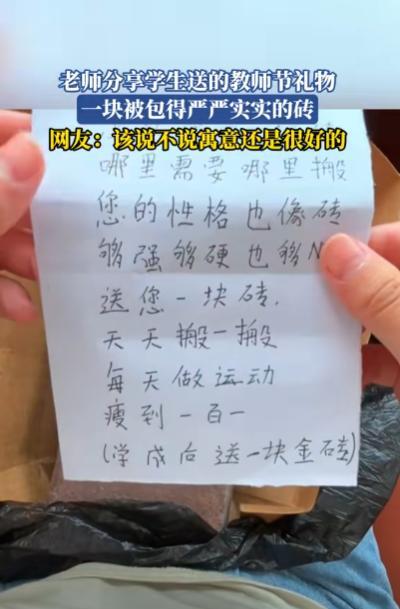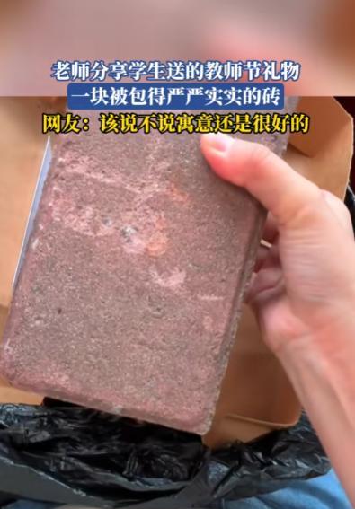 万万没想到!湖北,老师收到学生礼物,她本想拒绝,可学生却硬塞给她,她没办法,收下之后发现挺沉的,拆开一看,礼物被信封纸包裹,她猜想不会是那个吧?她小心翼翼打开,掏出来一看,居然是块巴掌大的红砖,棱角还磨得有点圆。下面还有个纸条,上面写着: 据视点新闻9月11日报道,教师节当天一名小女孩打破了世俗的礼物,送给了老师一块砖,老师看见砖的时候很是吃惊,然而下面的一张小纸条令老师感动不已。 在社会上很多家长都被陷入了一个“旋涡”里面,就是每次一到教师节的时候,家长们就开始纷纷用金钱来表达自己的诚意。 觉得只要是自己给老师送的东西够多又或者是够贵,老师就会在学校里面多照顾一下自己的孩子,在学习上多为自己的孩子操操心,所以现在每次一到教师节,都是家长们的攀比节日。 张女士(化名)是一名人民教师,她的教学风格很是独特所以她很受同学们的欢迎,此外她还有一个习惯就是每次在教师节的时候,她都会提前在家长群里面给家长们说。 节日当天不要给她送任何东西,就算是送了自己也不会收的,并且还说到,要是家长们真的想要表达的话就叫自己的孩子在当天给她说一声教师节快乐就好了。 所以只要是她教的孩子从来都不会一直陷入送礼物这一漩涡里面,然而就在前几天,放学的时候突然有一个女孩拿着一个黑色塑料袋包裹着的一个方方正正的东西, 张女士看见之后第一感觉就是金钱,于是她赶紧拒绝说老师不能收取这样的东西,直到小女孩说这个东西她自己想送给她的时候张女士就收下来了。 然而等张女士上车之后,打开里三层外三层地的包装之后,竟然映入眼帘的是一块砖,这时候张女士很是好奇觉得这个东西有什么寓意呢。 不料就在她拿起来的时候没突然掉落了一个小纸条上面写着对老师表达的感谢之情,而且还说了一句几句感人的话,就是等她学成归来之时她给老师换一个小金砖。 这时张女士纷纷流下了感动的泪水,觉得这是她这么多年以来收到的最有意义的礼物。 那么年对家长给老师送礼物这件事情,作为家长的你有什么看法呢?